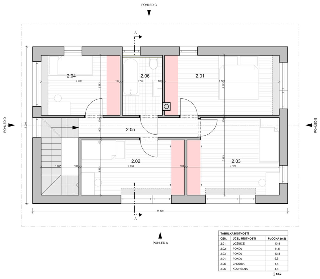 Moderní dvoupodlažní dům pro rodinu s dětmi o velikosti 5+1. Dům se čtyřmi ložnicemi, obytným prostorem, kuchyní, dvěma koupelnami, předsíní a technickou místností.