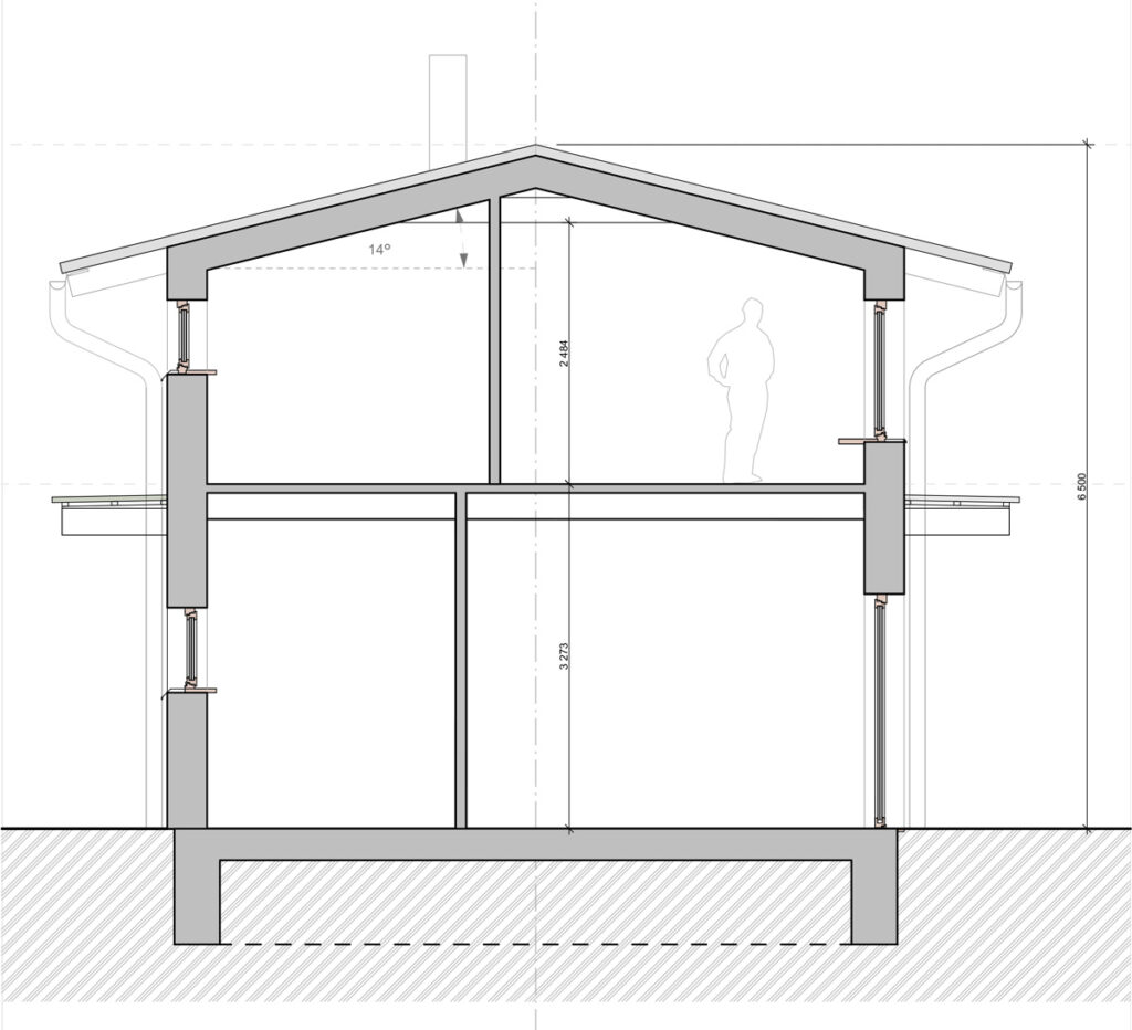 Základy jsou tvořeny jednoduchým systémem základových pasů pod nosnými stěnami. Nosné stěny jsou z vápenocementových dílců s venkovním zateplením. Tento typ konstrukce je standardním řešením nízkoenergetických domů. Klasická hambalková krovová soustava umožňující využití obytného podkroví.